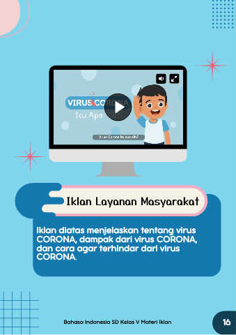 Iklan Layanan Masyarakat Iklan diatas menjelaskan tentang virus CORONA, dampak dari virus CORONA, dan cara agar terhindar dari virus CORONA. Bahasa Indonesia SD Kelas V Materi Iklan 16