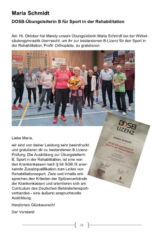 Am 16. Oktober hat Mandy unsere Übungsleiterin Maria Schmidt bei der Wirbel- Schüler/Jugend Dienstag 18:30 - 20:00 Uhr Sporthalle Nahe