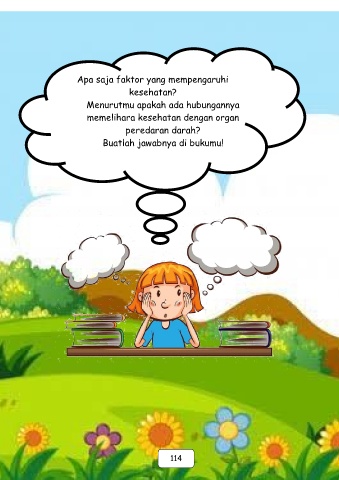 Apa saja faktor yang mempengaruhi kesehatan? Menurutmu apakah ada hubungannya memelihara kesehatan dengan organ peredaran darah? Buatlah jawabnya di bukumu! 114