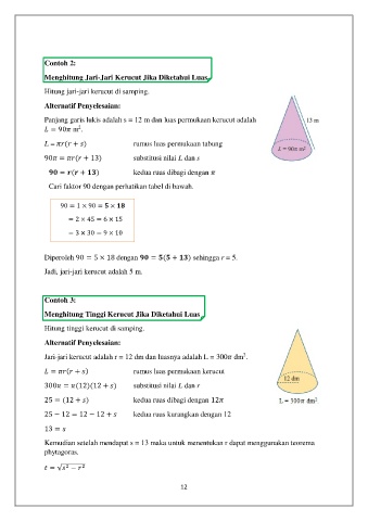 Panjang garis lukis adalah s = 12 m dan luas permukaan kerucut adalah