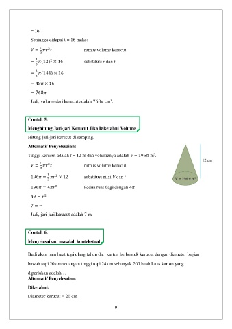 Tinggi kerucut adalah t = 12 m dan volumenya adalah V = 196 m .