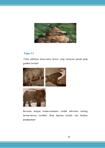 Tugas 2.3 Coba sebutkan nama-nama hewan yang terancam punah pada gambar berikut! Bersama dengan teman-temanmu carilah informasi tentang hewan-hewan tersebut! Buat laporan tertulis dan berikan pendapatmu! 34