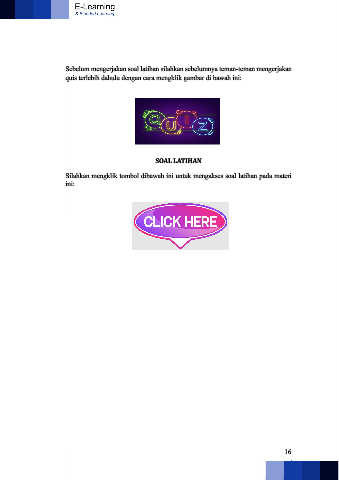 Sebelum mengerjakan soal latihan silahkan sebelumnya teman-teman mengerjakan quis terlebih dahulu dengan cara mengklik gambar di bawah ini: SOAL LATIHAN Silahkan mengklik tombol dibawah ini untuk mengakses soal latihan pada materi ini: 16