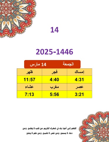 14 202 - 5 144 6 سرام 1 4 ةعمج لا رهظ رجف كاسمإ 11:57 4:40 : 4 31 ءاشع برغم رصع 7: 13 : 5 56 3: 21 نمو ،عشيخ لا بلق نم ميركلا كرهش في كب ذوعأ ينإ مهللا عفني لا ملع نمو ،عبشت لا سفن نمو ،عمسي لا ءاعد