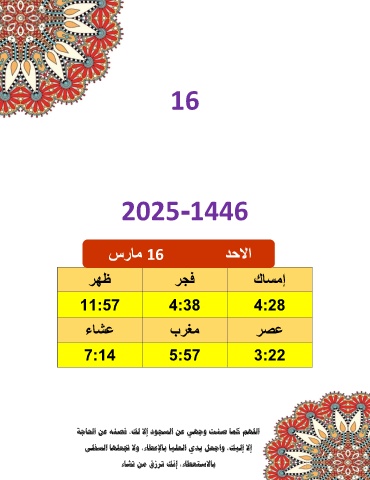 1 6 202 - 5 144 6 سرام 1 6 دح لاا رهظ رجف كاسمإ 11:57 4:38 : 4 28 ءاشع برغم رصع 7: 14 : 5 57 3: 22 ةجامحا نع هنصف ،كل لاإ دوجسلا نع يهجو تنص امك مهللا ىلفسلا اهلعتج لاو ،ءاطعلإاب ايلعلا يدي لعجاو ،كيلإ لاإ ءاشت نم قزرت كنإ ،ءاطعتسلااب
