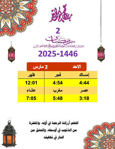 2 202 - 5 144 6 سرام 2 دحلا ا رهظ رجف كاسمإ 12:01 4:54 : 4 44 ءاشع برغم رصع 7: 05 : 5 48 3: 18 ةرفغلماو ،هلوأ في ةحمرلا انقزرأ مهللا نم قتعلاو ،هطسوأ في بونذلا نم هتياهن في رانلا