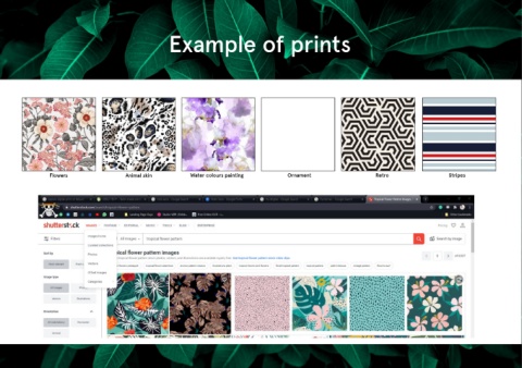 Example of prints Flowers Animal skin Water colours painting Ornament Retro Stripes