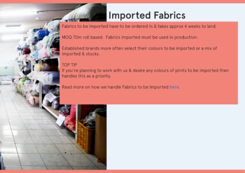MOQ 70m roll based. Fabrics imported must be used in production.