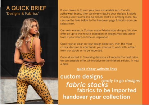‘Designs & Fabrics’ activewear brand, then we simply require your designs & fabric