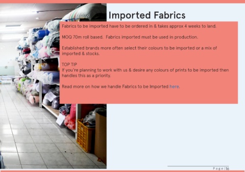 MOQ 70m roll based. Fabrics imported must be used in production.