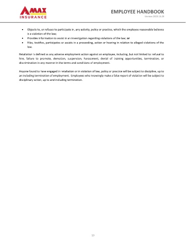 • Objects to, or refuses to participate in, any activity, policy or practice, which the employee reasonable believes