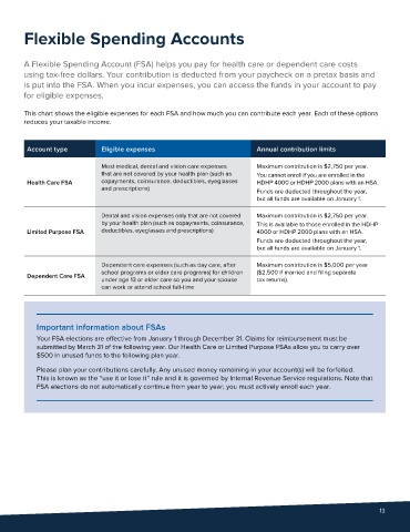 This chart shows the eligible expenses for each FSA and how much you can contribute each year. Each of these options