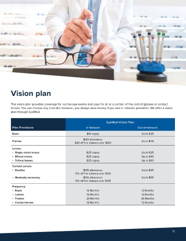 The vision plan provides coverage for routine eye exams and pays for all or a portion of the cost of glasses or contact