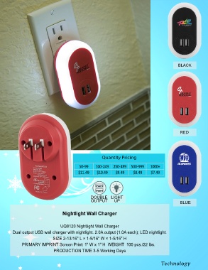 Dual output USB wall charger with nightlight. 2.0A output (1.0A each); LED nightlight.