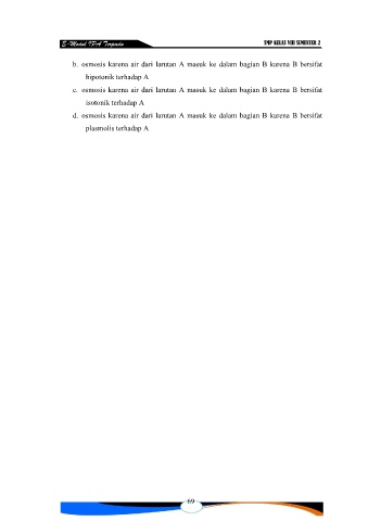 d. osmosis karena air dari larutan A masuk ke dalam bagian B karena B bersifat