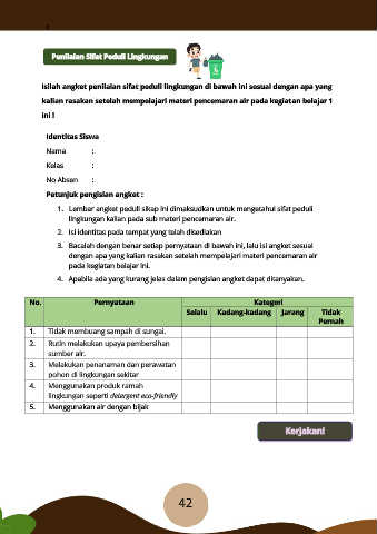 Isilah angket penilaian sifat peduli lingkungan di bawah ini sesuai dengan apa yang