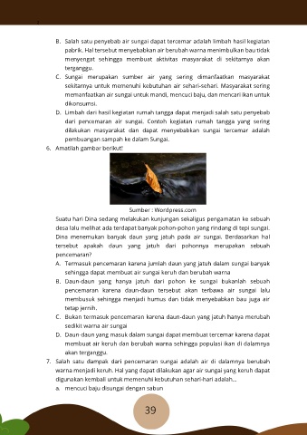 7. Salah satu dampak dari pencemaran sungai adalah air di dalamnya berubah