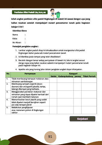 Isilah angket penilaian sifat peduli lingkungan di bawah ini sesuai dengan apa yang
