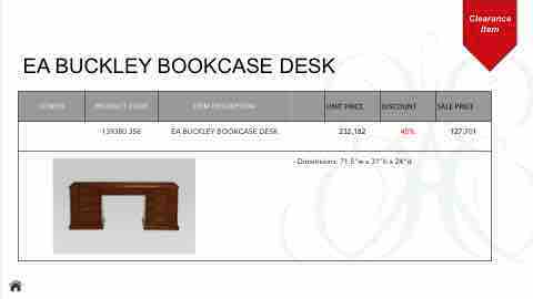 Clearance Item EA BUCKLEY BOOKCASE DESK CONFIG PRODUCT CODE ITEM DESCRIPTION UNIT PRICE DISCOUNT SALE PRICE 139380 356 EA BUCKLEY BOOKCASE DESK 232,182 45% 127,701 - Dimensions: 71.5"w x 31"h x 24"d