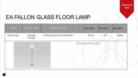 Clearance Item EA FALLON GLASS FLOOR LAMP CONFIG PRODUCT CODE ITEM DESCRIPTION UNIT PRICE DISCOUNT SALE PRICE D4NOCLSEL 092164B EA FALLON GLASS FLOOR LAMP 58,710 55% 26,420 092164S - Dimensions: 9" dia. x 62" h