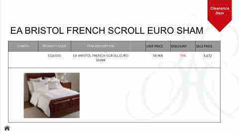 Clearance Item EA BRISTOL FRENCH SCROLL EURO SHAM CONFIG PRODUCT CODE ITEM DESCRIPTION UNIT PRICE DISCOUNT SALE PRICE 032650D EA BRISTOL FRENCH SCROLL EURO 18,905 70% 5,672 SHAM