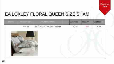 Clearance Item EA LOXLEY FLORAL QUEEN SIZE SHAM CONFIG PRODUCT CODE ITEM DESCRIPTION UNIT PRICE DISCOUNT SALE PRICE 032835B EA LOXLEY FLORAL QUEEN SHAM 6,156 45% 3,386