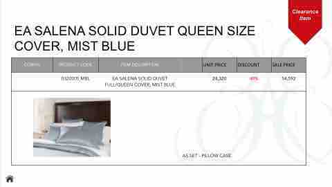 Clearance Item EA SALENA SOLID DUVET QUEEN SIZE COVER, MIST BLUE CONFIG PRODUCT CODE ITEM DESCRIPTION UNIT PRICE DISCOUNT SALE PRICE 0320005 MBL EA SALENA SOLID DUVET 24,320 40% 14,592 FULL/QUEEN COVER, MIST BLUE AS SET - PILLOW CASE