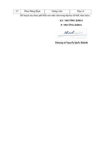 13 Phan Dũng Định Giảng viên Thạc sĩ Kế hoạch này được phổ biến cho sinh viên trong lớp học để biết, thực hiện./. KT. TRƯỞNG KHOA P. TRƯỞNG KHOA Thượng tá Nguyễn Quốc Khánh