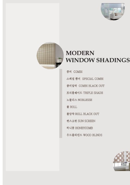 MODERN WINDOW SHADINGS 콤비 Combi 스페셜 콤비 Special Combi 콤비 암막 Combi Black Out 트리플 쉐이드 Triple Shade 트리플 블랙아웃 Triple Black Out 노블리스 Noblesse 롤 Roll 롤암막 Roll Black Out 썬스크린 Sun Screen 허니콤 쉐이드 Honeycomb Shade 우드블라인드 Wood Blinds 전동시스템 Auto Motor System