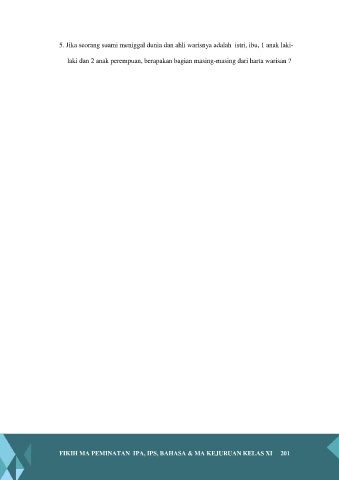 5. Jika seorang suami meniggal dunia dan ahli warisnya adalah istri, ibu, 1 anak laki- laki dan 2 anak perempuan, berapakan bagian masing-masing dari harta warisan ? FIKIH MA PEMINATAN IPA, IPS, BAHASA & MA KEJURUAN KELAS XI 201