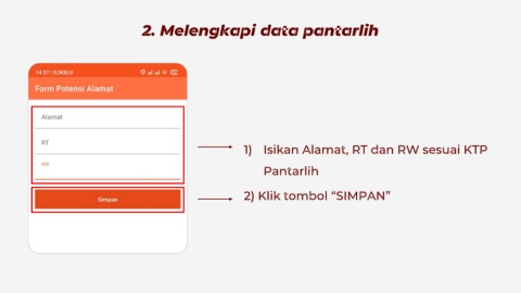 2. Melengkapi data pantarlih 1) Isikan Alamat, RT dan RW sesuai KTP Pantarlih 2) Klik tombol “SIMPAN”