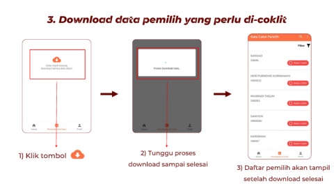 3. Download data pemilih yang perlu di-coklit 1) Klik tombol 2) Tunggu proses download sampai selesai 3) Daftar pemilih akan tampil setelah download selesai