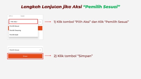Langkah Lanjutan jika Aksi “Pemilih Sesuai” 1) Klik tombol “Pilih Aksi” dan Klik “Pemilih Sesuai” 2) Klik tombol “Simpan”