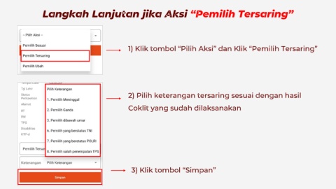 Langkah Lanjutan jika Aksi “Pemilih Tersaring” 1) Klik tombol “Pilih Aksi” dan Klik “Pemilih Tersaring” 2) Pilih keterangan tersaring sesuai dengan hasil Coklit yang sudah dilaksanakan 3) Klik tombol “Simpan”