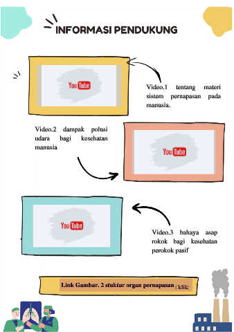 Video.1 tentang materi sistem pernapasan pada manusia. Video.2 dampak polusi udara bagi kesehatan manusia Video.3 bahaya asap rokok bagi kesehatan perokok pasif Link Gambar. 2 stuktur organ pernapasan (klik)