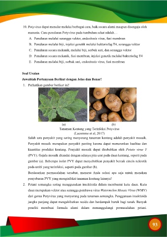 manusia. Cara penularan Potyvirus pada tumbuhan sehat adalah…