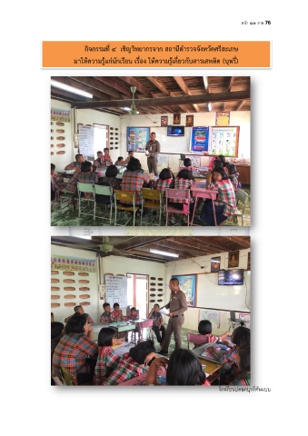 หนา ๑๓ จาก 76 กิจกรรมที่ ๔ เชิญวิทยากรจาก สถานีตำรวจจังหวัดศรีสะเกษ มาให้ความรู้แก่นักเรียน เรื่อง ให้ความรู้เกี่ยวกับสารเสพติด (บุหรี่) ี่ โรงเรียนปลอดบุหรต้นแบบ