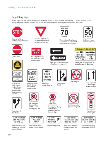 These signs tell you about driving laws and regulations. It is an offence under the B.C. Motor Vehicle Act to