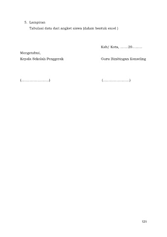 5. Lampiran Tabulasi data dari angket siswa (dalam bentuk excel ) Kab/ Kota, …….20……… Mengetahui, Kepala Sekolah Penggerak Guru Bimbingan Konseling (…………………….) (....………………..) 121