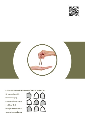 EXKLUSIVER VERKAUF UND PERSÖNLICHE BERATUNG SL Immobilien GbR Brunnenweg 14 92353 Postbauer-Heng 09188 307 81 81 info@sl-immobilien.eu www.sl-immobilien.eu