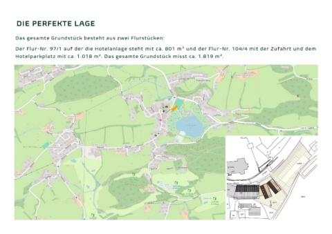 Der Flur-Nr. 97/1 auf der die Hotelanlage steht mit ca. 801 m² und der Flur-Nr. 104/4 mit der Zufahrt und dem