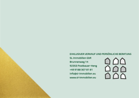 EXKLUSIVER VERKAUF UND PERSÖNLICHE BERATUNG SL Immobilien GbR Brunnenweg 14 92353 Postbauer-Heng +49 9188 307 81 81 info@sl-immobilien.eu www.sl-immobilien.eu