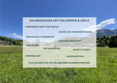 EIN MAGISCHER ORT FÜR KÖRPER & SEELE STÄRKENDE KRAFT DER NATUR UNZÄHLIGE SONNENSTUNDEN GENUSSVOLLE MOMENTE GASTFREUNDSCHAFT HEILKLIMA ENTSPANNUNG GEMÜTLICHKEIT ERDENGLÜCK WONNEGEFÜHL DAS ERLEBEN SIE AUF SALZBURGER SONNENTERRASSE!