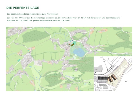 Der Flur-Nr. 97/1 auf der die Hotelanlage steht mit ca. 801 m² und der Flur-Nr. 104/4 mit der Zufahrt und dem Hotelpark-
