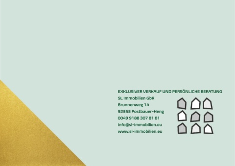 EXKLUSIVER VERKAUF UND PERSÖNLICHE BERATUNG SL Immobilien GbR Brunnenweg 14 92353 Postbauer-Heng 0049 9188 307 81 81 info@sl-immobilien.eu www.sl-immobilien.eu