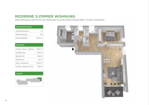 Diese Wohnung ist identisch mit den Wohnungen 10 und 19 (Unterschied bei Balkon, Terrasse, Gartenanteil). Diese Wohnung ist identisch mit den Wohnungen 03, 06, 07, 08, 11, 12, 15, 16, 17, 20, 21, 24, 25 und 26 (Unterschied bei Balkon, Terrasse, Gartenanteil).