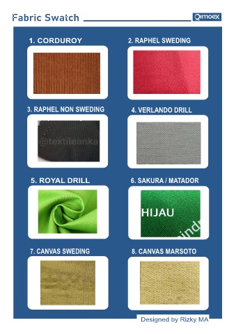 Fabric Swatch 1. CORDUROY 2. RAPHEL SWEDING 3. RAPHEL NON SWEDING 4. VERLANDO DRILL 5. ROYAL DRILL 6. SAKURA / MATADOR 7. CANVAS SWEDING 8. CANVAS MARSOTO Designed by Rizky MA