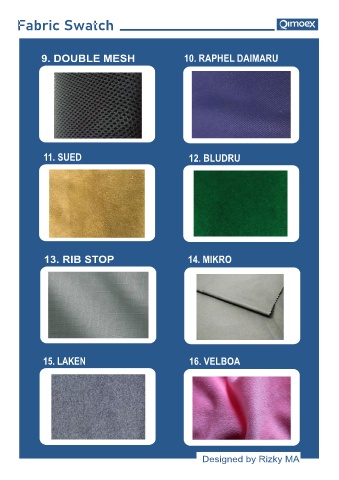 Fabric Swatch 9. DOUBLE MESH 10. RAPHEL DAIMARU 11. SUED 12. BLUDRU 13. RIB STOP 14. MIKRO 15. LAKEN 16. VELBOA Designed by Rizky MA