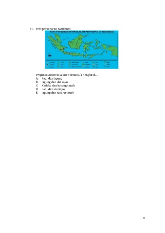 10. Peta persebaran hasil bumi Propinsi Sulawesi Selatan termasuk penghasil…. A. Padi dan jagung B. Jagung dan ubi kayu C. Kedelai dan kacang tanah D. Padi dan ubi kayu E. Jagung dan kacang tanah 31