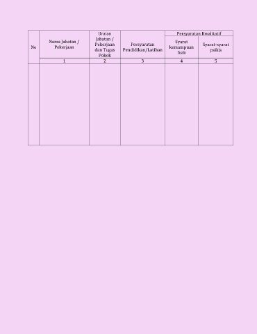 Uraian Persyaratan Kwalitatif Jabatan / Nama Jabatan / Syarat No Pekerjaan Pekerjaan Persyaratan kemampuan Syarat-syarat dan Tugas Pendidikan/Latihan fisik psikis Pokok 1 2 3 4 5